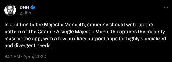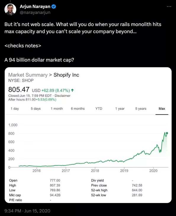Dropbox, Twitter/X, Facebook, Instagram, Shopify, Stack Overflow — эти и другие компании начинали как монолитные базы кода. Многие по сей день имеют в своей основе монолит. Stack Overflow вызывает гордость за то, как мало оборудования им нужно для работы огромного сайта. Shopify по-прежнему остается монолитом Rails, использующим проверенный и надежный Resque для обработки миллиардов задач.