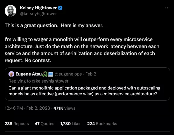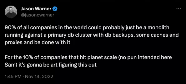 Аудит выявил интересную закономерность: многие стартапы испытывали своего рода синдром коллективного самозванца, создавая понятные, простые и производительные системы. Существует догма, запрещающая начинать работу с микросервисами с первого дня, независимо от проблемы. «Все занимаются микросервисами, а у нас есть единый монолит Django, поддерживаемый всего несколькими инженерами, и экземпляр MySQL — что мы делаем не так?». Ответ был почти всегда: «ничего».