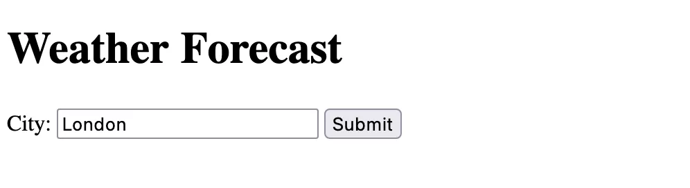 Мы получили наш эндпоинт, но необработанный JSON обычному пользователю не очень полезен. В реальном приложении мы, вероятно, отдаём ответ JSON на эндпоинте API (скажем /api/v1/weather/:city) и добавим отдельный эндпоинт, который возвращает HTML-страницу. Для простоты мы просто вернем HTML-страницу напрямую.